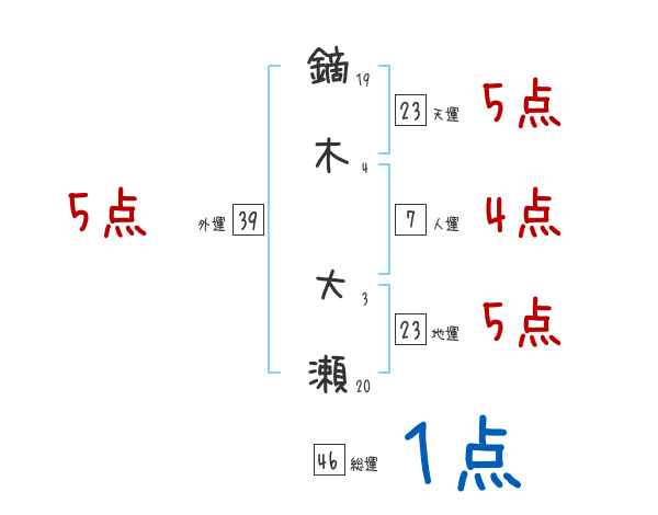 天運![]() | 鏑木大瀬さんの天運は23画の5つ星!想像力に優れ活力がある。一代で成功し名誉を手に入れる。 家系が持つ宿命的な運勢を表します。祖先から受け継いだ苗字ですので自分の力が及びません。家柄を象徴します。 |