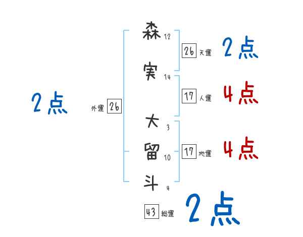天運![]() | 森実大留斗さんの天運は26画の2つ星!波瀾万丈かも。信頼できる人を大事にしましょう。 家系が持つ宿命的な運勢を表します。祖先から受け継いだ苗字ですので自分の力が及びません。家柄を象徴します。 |