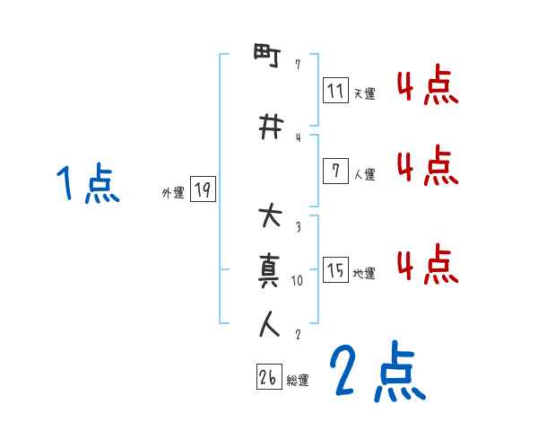 天運![]() | 町井大真人さんの天運は11画の4つ星!着実に富や地位を得る幸運な人生。 家系が持つ宿命的な運勢を表します。祖先から受け継いだ苗字ですので自分の力が及びません。家柄を象徴します。 |