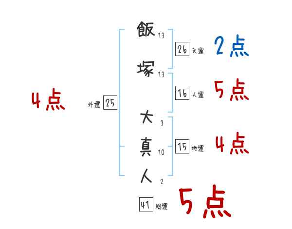 人運![]() | 飯塚大真人さんの人運は16画の5つ星!人望が厚く大きく発展する。逆転成功が見える。 性格や才能などを表す2番目に重要な運勢です。人間関係や協調性、社会的な成功に影響します。主に20歳から50歳ぐらいまでの中年期の運勢を表します。 |