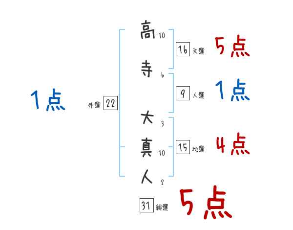 天運![]() | 高寺大真人さんの天運は16画の5つ星!人望が厚く大きく発展する。逆転成功が見える。 家系が持つ宿命的な運勢を表します。祖先から受け継いだ苗字ですので自分の力が及びません。家柄を象徴します。 |