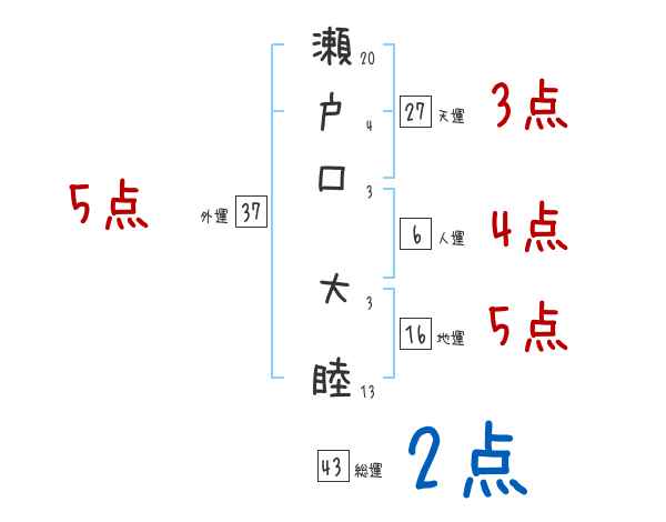 天運![]() | 瀬戸口大睦さんの天運は27画の3つ星!頭脳明晰だが強情で摩擦が多い傾向。孤立に注意。 家系が持つ宿命的な運勢を表します。祖先から受け継いだ苗字ですので自分の力が及びません。家柄を象徴します。 |