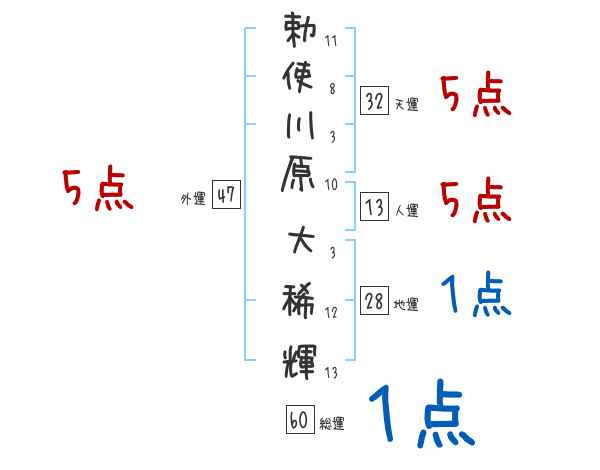 天運![]() | 勅使川原大稀輝さんの天運は32画の5つ星!柔軟性があり成功する。チャンスが多く金運が良い。 家系が持つ宿命的な運勢を表します。祖先から受け継いだ苗字ですので自分の力が及びません。家柄を象徴します。 |