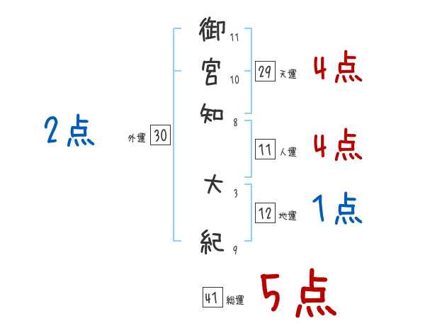 外運![]() | 御宮知大紀さんの外運は30画の2つ星!浮き沈みの激しさに注意しましょう。 生活面を象徴する運勢です。外部から受ける影響力を表し、結婚運、家庭運や職場、環境への順応性を表します。 |