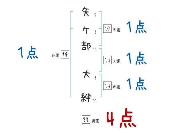 外運![]() | 矢ヶ部大絆さんの外運は19画の1つ星!優れた才能を持ちますが、協調性が足りないことも。周りの人と協力する事を意識しましょう。 生活面を象徴する運勢です。外部から受ける影響力を表し、結婚運、家庭運や職場、環境への順応性を表します。 |