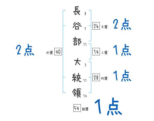 天運![]() | 長谷部大統領さんの天運は26画の2つ星!波瀾万丈かも。信頼できる人を大事にしましょう。 家系が持つ宿命的な運勢を表します。祖先から受け継いだ苗字ですので自分の力が及びません。家柄を象徴します。 |