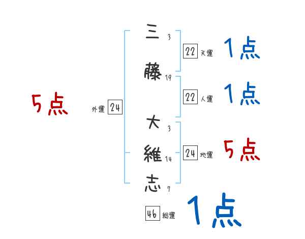 外運![]() | 三藤大維志さんの外運は24画の5つ星!家庭運が良く順調な人生。金運にも恵まれる。 生活面を象徴する運勢です。外部から受ける影響力を表し、結婚運、家庭運や職場、環境への順応性を表します。 |