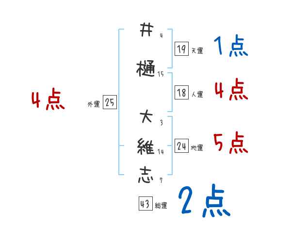 総運![]() | 井樋大維志さんの総運は43画の2つ星!頑固な性格で独立心が強いかも。やや非現実的で浪費に注意しましょう。 あなたの人生を表す1番重要な運勢です。生涯を通じて影響する総合運となり、主に50歳以降の晩年期に影響を及ぼします。 |
