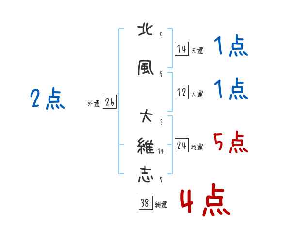 天運![]() | 北風大維志さんの天運は14画の1つ星!人に対して優しいがストレスを溜め込みがち。人間関係のトラブルを避けるよう気をつけましょう。 家系が持つ宿命的な運勢を表します。祖先から受け継いだ苗字ですので自分の力が及びません。家柄を象徴します。 |