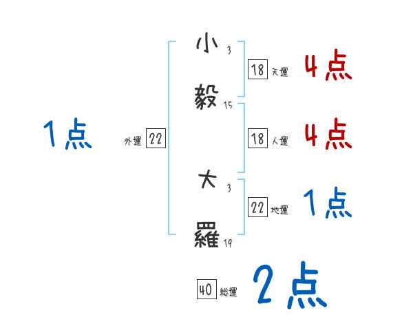 天運![]() | 小毅大羅さんの天運は18画の4つ星!情熱的で剛気。忍耐力があり信頼される。 家系が持つ宿命的な運勢を表します。祖先から受け継いだ苗字ですので自分の力が及びません。家柄を象徴します。 |