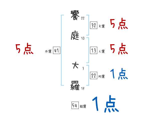 天運![]() | 饗庭大羅さんの天運は32画の5つ星!柔軟性があり成功する。チャンスが多く金運が良い。 家系が持つ宿命的な運勢を表します。祖先から受け継いだ苗字ですので自分の力が及びません。家柄を象徴します。 |