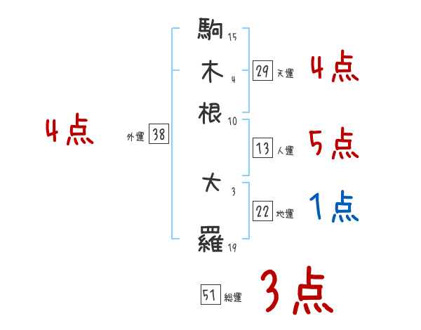 人運![]() | 駒木根大羅さんの人運は13画の5つ星!才能に恵まれ人気がある。名声を手に入れる。円満な人生。 性格や才能などを表す2番目に重要な運勢です。人間関係や協調性、社会的な成功に影響します。主に20歳から50歳ぐらいまでの中年期の運勢を表します。 |