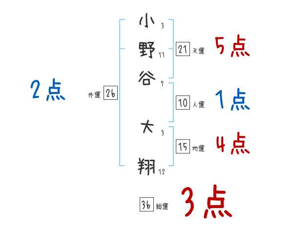 天運![]() | 小野谷大翔さんの天運は21画の5つ星!統率力がある。独立し成功する。名誉を手に入れる。 家系が持つ宿命的な運勢を表します。祖先から受け継いだ苗字ですので自分の力が及びません。家柄を象徴します。 |