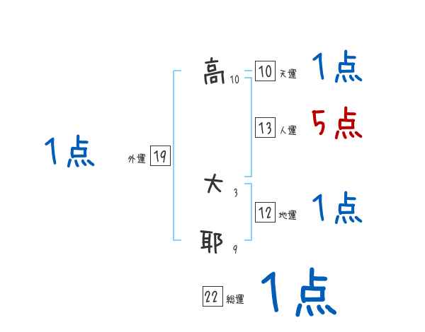 総運![]() | 高大耶さんの総運は22画の1つ星!努力することが苦手ないっぽう手先が器用。芸術性にも優れる。 あなたの人生を表す1番重要な運勢です。生涯を通じて影響する総合運となり、主に50歳以降の晩年期に影響を及ぼします。 |