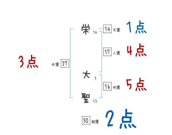 総運![]() | 栄大聖さんの総運は30画の2つ星!浮き沈みの激しさに注意しましょう。 あなたの人生を表す1番重要な運勢です。生涯を通じて影響する総合運となり、主に50歳以降の晩年期に影響を及ぼします。 |