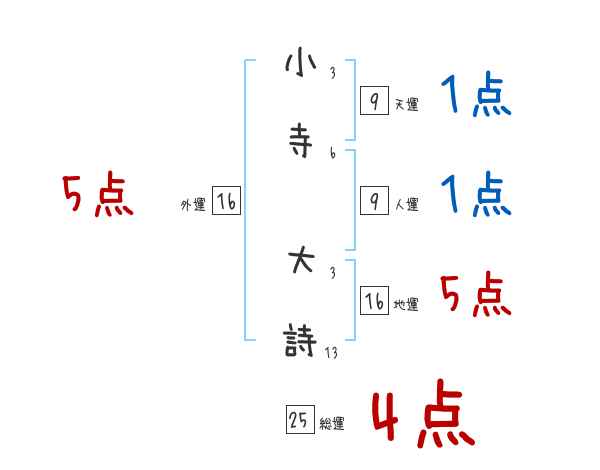 外運![]() | 小寺大詩さんの外運は16画の5つ星!人望が厚く大きく発展する。逆転成功が見える。 生活面を象徴する運勢です。外部から受ける影響力を表し、結婚運、家庭運や職場、環境への順応性を表します。 |