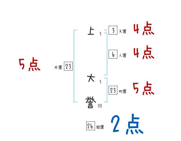 外運![]() | 上大誉さんの外運は23画の5つ星!想像力に優れ活力がある。一代で成功し名誉を手に入れる。 生活面を象徴する運勢です。外部から受ける影響力を表し、結婚運、家庭運や職場、環境への順応性を表します。 |