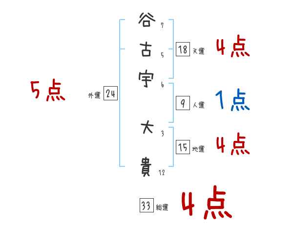 天運![]() | 谷古宇大貴さんの天運は18画の4つ星!情熱的で剛気。忍耐力があり信頼される。 家系が持つ宿命的な運勢を表します。祖先から受け継いだ苗字ですので自分の力が及びません。家柄を象徴します。 |