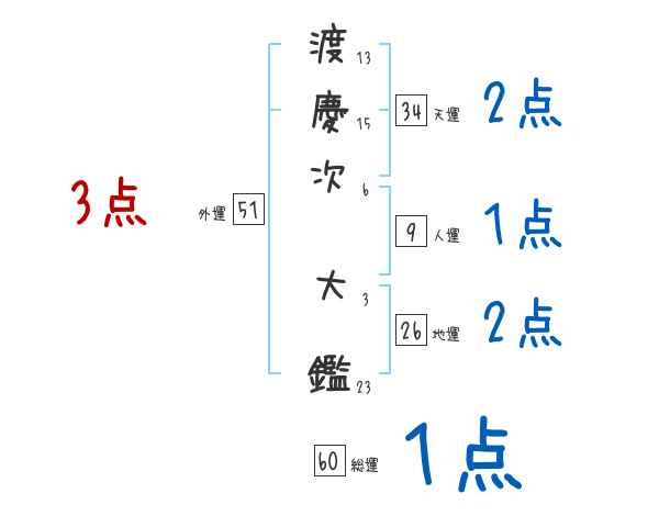 外運![]() | 渡慶次大鑑さんの外運は51画の3つ星!変化が激しく、危険に注意。堅実な性格。 生活面を象徴する運勢です。外部から受ける影響力を表し、結婚運、家庭運や職場、環境への順応性を表します。 |