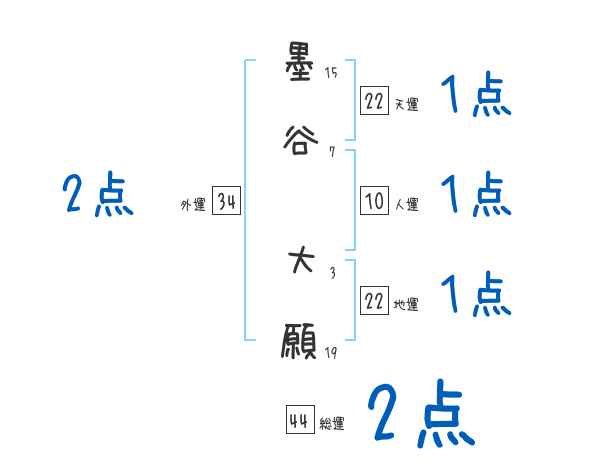 総運![]() | 墨谷大願さんの総運は44画の2つ星!誠実で慎重な性格。物事を考えすぎないように注意しましょう。 あなたの人生を表す1番重要な運勢です。生涯を通じて影響する総合運となり、主に50歳以降の晩年期に影響を及ぼします。 |
