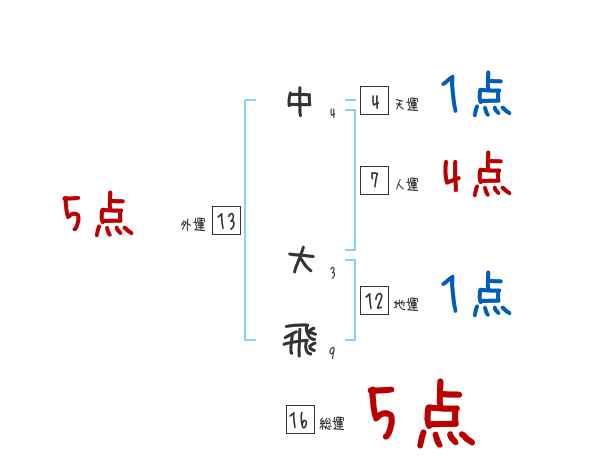 外運![]() | 中大飛さんの外運は13画の5つ星!才能に恵まれ人気がある。名声を手に入れる。円満な人生。 生活面を象徴する運勢です。外部から受ける影響力を表し、結婚運、家庭運や職場、環境への順応性を表します。 |