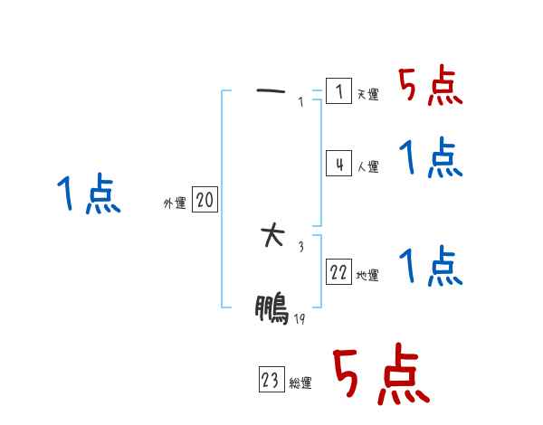 天運![]() | 一大鵬さんの天運は1画の5つ星!行動力、指導力があり出世し繁栄する。幸運に恵まれる。 家系が持つ宿命的な運勢を表します。祖先から受け継いだ苗字ですので自分の力が及びません。家柄を象徴します。 |