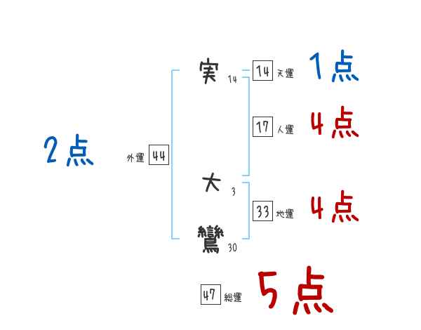 総運![]() | 実大鸞さんの総運は47画の5つ星!実力が開花し発展する円満な人生。財に恵まれる。 あなたの人生を表す1番重要な運勢です。生涯を通じて影響する総合運となり、主に50歳以降の晩年期に影響を及ぼします。 |