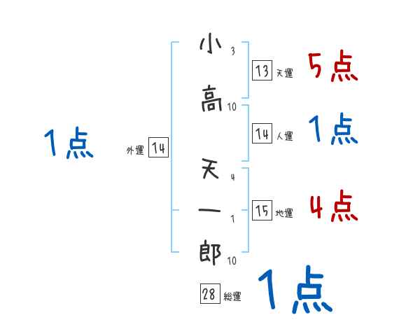 外運![]() | 小高天一郎さんの外運は14画の1つ星!人に対して優しいがストレスを溜め込みがち。人間関係のトラブルを避けるよう気をつけましょう。 生活面を象徴する運勢です。外部から受ける影響力を表し、結婚運、家庭運や職場、環境への順応性を表します。 |