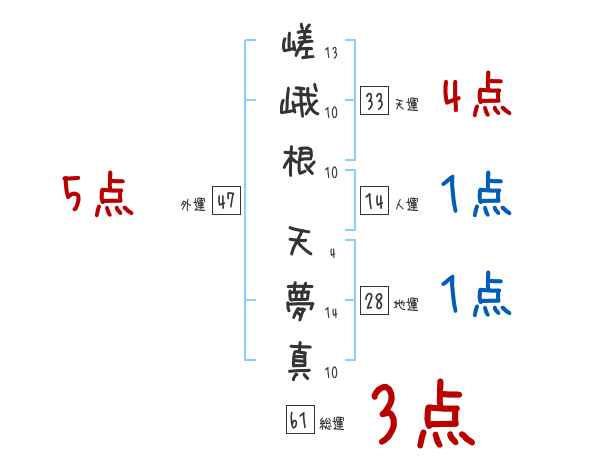 総運![]() | 嵯峨根天夢真さんの総運は61画の3つ星!強情な性格でうぬぼれタイプ。自ら破滅する。 あなたの人生を表す1番重要な運勢です。生涯を通じて影響する総合運となり、主に50歳以降の晩年期に影響を及ぼします。 |