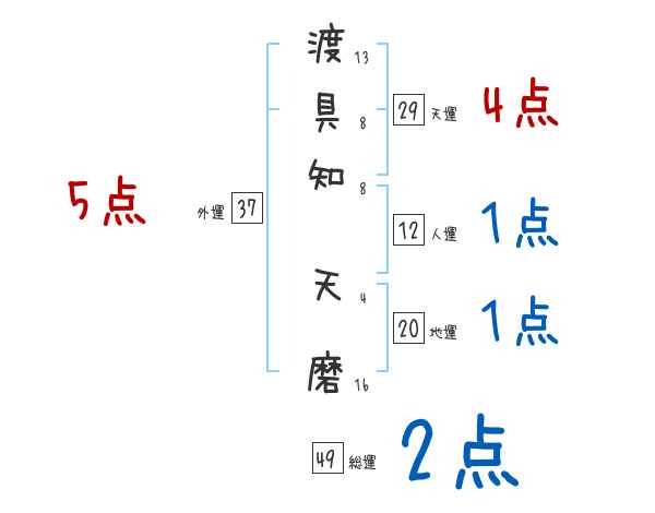 外運![]() | 渡具知天磨さんの外運は37画の5つ星!努力家で順応性に優れる。現実的な考え方ができ忠実に物事をこなす。 生活面を象徴する運勢です。外部から受ける影響力を表し、結婚運、家庭運や職場、環境への順応性を表します。 |