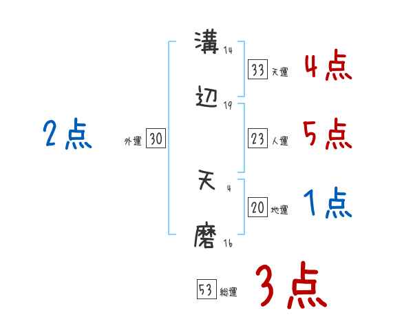 人運![]() | 溝辺天磨さんの人運は23画の5つ星!想像力に優れ活力がある。一代で成功し名誉を手に入れる。 性格や才能などを表す2番目に重要な運勢です。人間関係や協調性、社会的な成功に影響します。主に20歳から50歳ぐらいまでの中年期の運勢を表します。 |