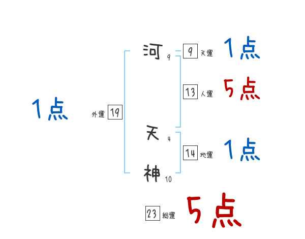 天運![]() | 河天神さんの天運は9画の1つ星!消極的で才能を発揮することが苦手なことも。周りの意見に耳を傾けましょう。 家系が持つ宿命的な運勢を表します。祖先から受け継いだ苗字ですので自分の力が及びません。家柄を象徴します。 |