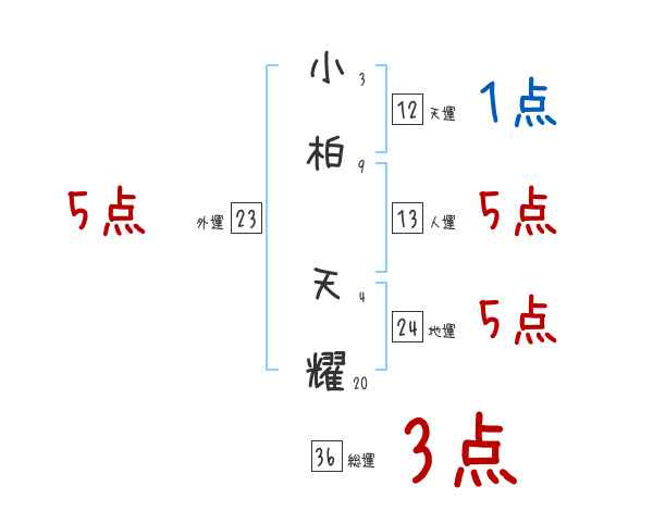 外運![]() | 小柏天耀さんの外運は23画の5つ星!想像力に優れ活力がある。一代で成功し名誉を手に入れる。 生活面を象徴する運勢です。外部から受ける影響力を表し、結婚運、家庭運や職場、環境への順応性を表します。 |