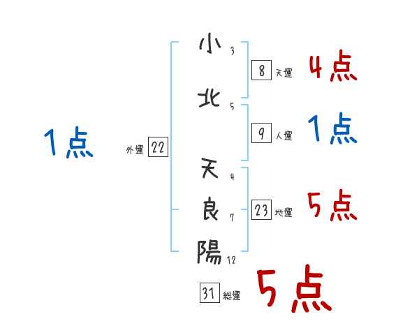天運![]() | 小北天良陽さんの天運は8画の4つ星!勤勉家。根気強く努力し成功する。忍耐力がある。 家系が持つ宿命的な運勢を表します。祖先から受け継いだ苗字ですので自分の力が及びません。家柄を象徴します。 |