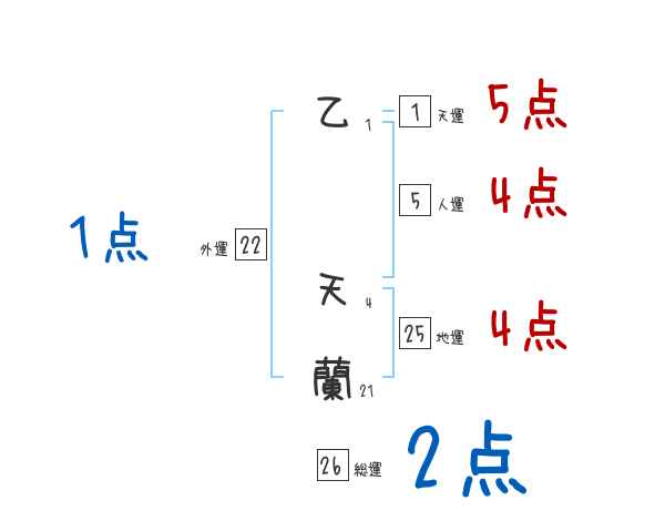 天運![]() | 乙天蘭さんの天運は1画の5つ星!行動力、指導力があり出世し繁栄する。幸運に恵まれる。 家系が持つ宿命的な運勢を表します。祖先から受け継いだ苗字ですので自分の力が及びません。家柄を象徴します。 |