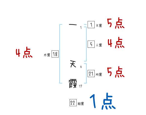 天運![]() | 一天霞さんの天運は1画の5つ星!行動力、指導力があり出世し繁栄する。幸運に恵まれる。 家系が持つ宿命的な運勢を表します。祖先から受け継いだ苗字ですので自分の力が及びません。家柄を象徴します。 |