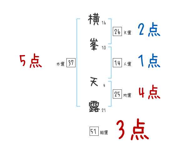 総運![]() | 横峯天露さんの総運は51画の3つ星!変化が激しく、危険に注意。堅実な性格。 あなたの人生を表す1番重要な運勢です。生涯を通じて影響する総合運となり、主に50歳以降の晩年期に影響を及ぼします。 |