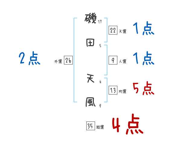 外運![]() | 磯田天風さんの外運は26画の2つ星!波瀾万丈かも。信頼できる人を大事にしましょう。 生活面を象徴する運勢です。外部から受ける影響力を表し、結婚運、家庭運や職場、環境への順応性を表します。 |