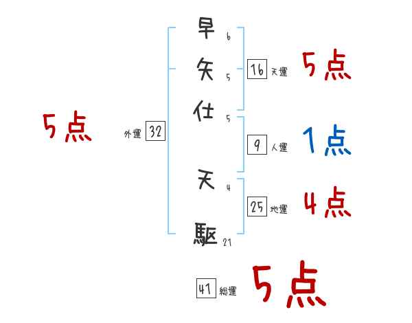 外運![]() | 早矢仕天駆さんの外運は32画の5つ星!柔軟性があり成功する。チャンスが多く金運が良い。 生活面を象徴する運勢です。外部から受ける影響力を表し、結婚運、家庭運や職場、環境への順応性を表します。 |