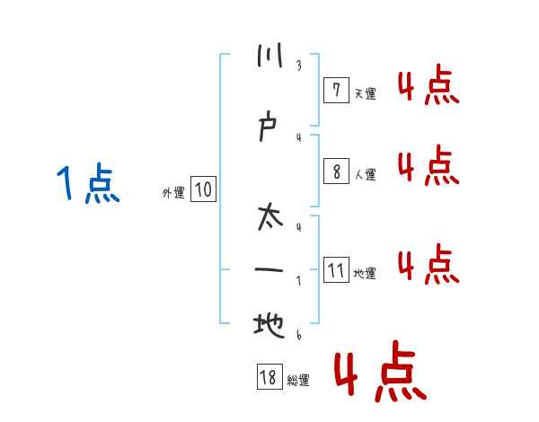 天運![]() | 川戸太一地さんの天運は7画の4つ星!強い意志や信念を持ち独立心が強い。自立する。 家系が持つ宿命的な運勢を表します。祖先から受け継いだ苗字ですので自分の力が及びません。家柄を象徴します。 |