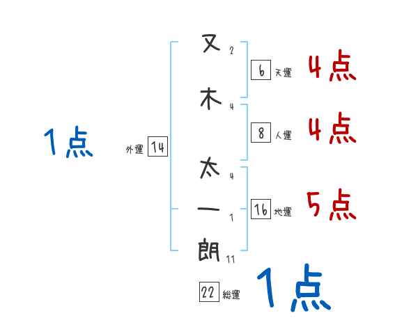 総運![]() | 又木太一朗さんの総運は22画の1つ星!努力することが苦手ないっぽう手先が器用。芸術性にも優れる。 あなたの人生を表す1番重要な運勢です。生涯を通じて影響する総合運となり、主に50歳以降の晩年期に影響を及ぼします。 |