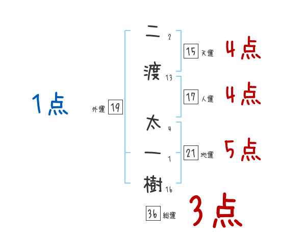 外運![]() | 二渡太一樹さんの外運は19画の1つ星!優れた才能を持ちますが、協調性が足りないことも。周りの人と協力する事を意識しましょう。 生活面を象徴する運勢です。外部から受ける影響力を表し、結婚運、家庭運や職場、環境への順応性を表します。 |