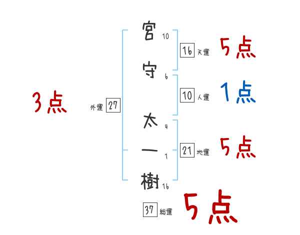 天運![]() | 宮守太一樹さんの天運は16画の5つ星!人望が厚く大きく発展する。逆転成功が見える。 家系が持つ宿命的な運勢を表します。祖先から受け継いだ苗字ですので自分の力が及びません。家柄を象徴します。 |