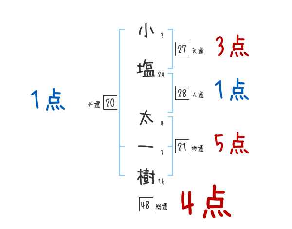 天運![]() | 小塩太一樹さんの天運は27画の3つ星!頭脳明晰だが強情で摩擦が多い傾向。孤立に注意。 家系が持つ宿命的な運勢を表します。祖先から受け継いだ苗字ですので自分の力が及びません。家柄を象徴します。 |