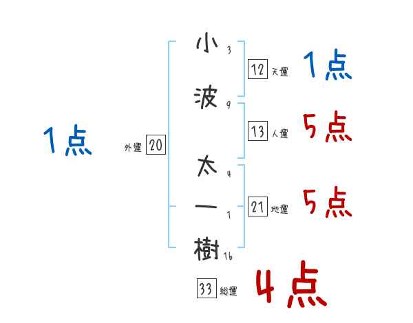 天運![]() | 小波太一樹さんの天運は12画の1つ星!簡単な失敗で諦めてしまいやすいかも。着実に行動すると良いでしょう。 家系が持つ宿命的な運勢を表します。祖先から受け継いだ苗字ですので自分の力が及びません。家柄を象徴します。 |