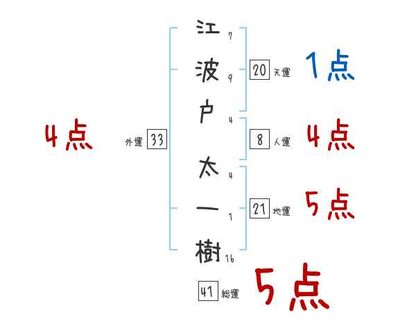 外運![]() | 江波戸太一樹さんの外運は33画の4つ星!権力志向でプライドが高い。勇気があり運を切り開き成功する。 生活面を象徴する運勢です。外部から受ける影響力を表し、結婚運、家庭運や職場、環境への順応性を表します。 |