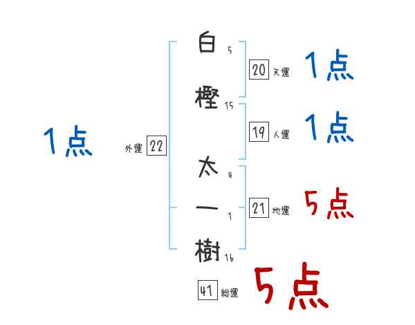 総運![]() | 白樫太一樹さんの総運は41画の5つ星!大志を抱き、目標に向かって実力を発揮し達成する。温和な性格。 あなたの人生を表す1番重要な運勢です。生涯を通じて影響する総合運となり、主に50歳以降の晩年期に影響を及ぼします。 |