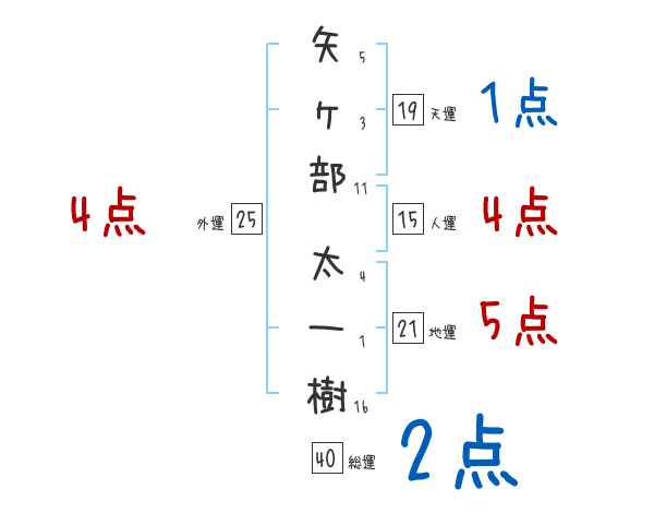 天運![]() | 矢ヶ部太一樹さんの天運は19画の1つ星!優れた才能を持ちますが、協調性が足りないことも。周りの人と協力する事を意識しましょう。 家系が持つ宿命的な運勢を表します。祖先から受け継いだ苗字ですので自分の力が及びません。家柄を象徴します。 |