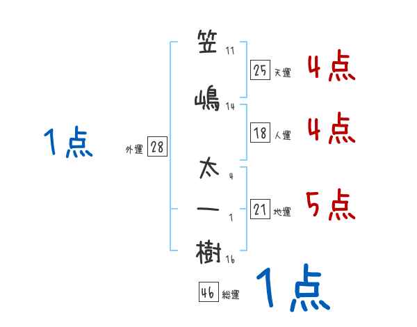 天運![]() | 笠嶋太一樹さんの天運は25画の4つ星!個性があり才能があふれる。強運の持ち主で発展する。 家系が持つ宿命的な運勢を表します。祖先から受け継いだ苗字ですので自分の力が及びません。家柄を象徴します。 |