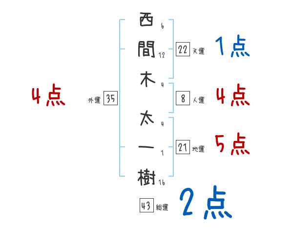 外運![]() | 西間木太一樹さんの外運は35画の4つ星!温厚な性格で感受性が高い。穏和な性格で人望が厚い。 生活面を象徴する運勢です。外部から受ける影響力を表し、結婚運、家庭運や職場、環境への順応性を表します。 |
